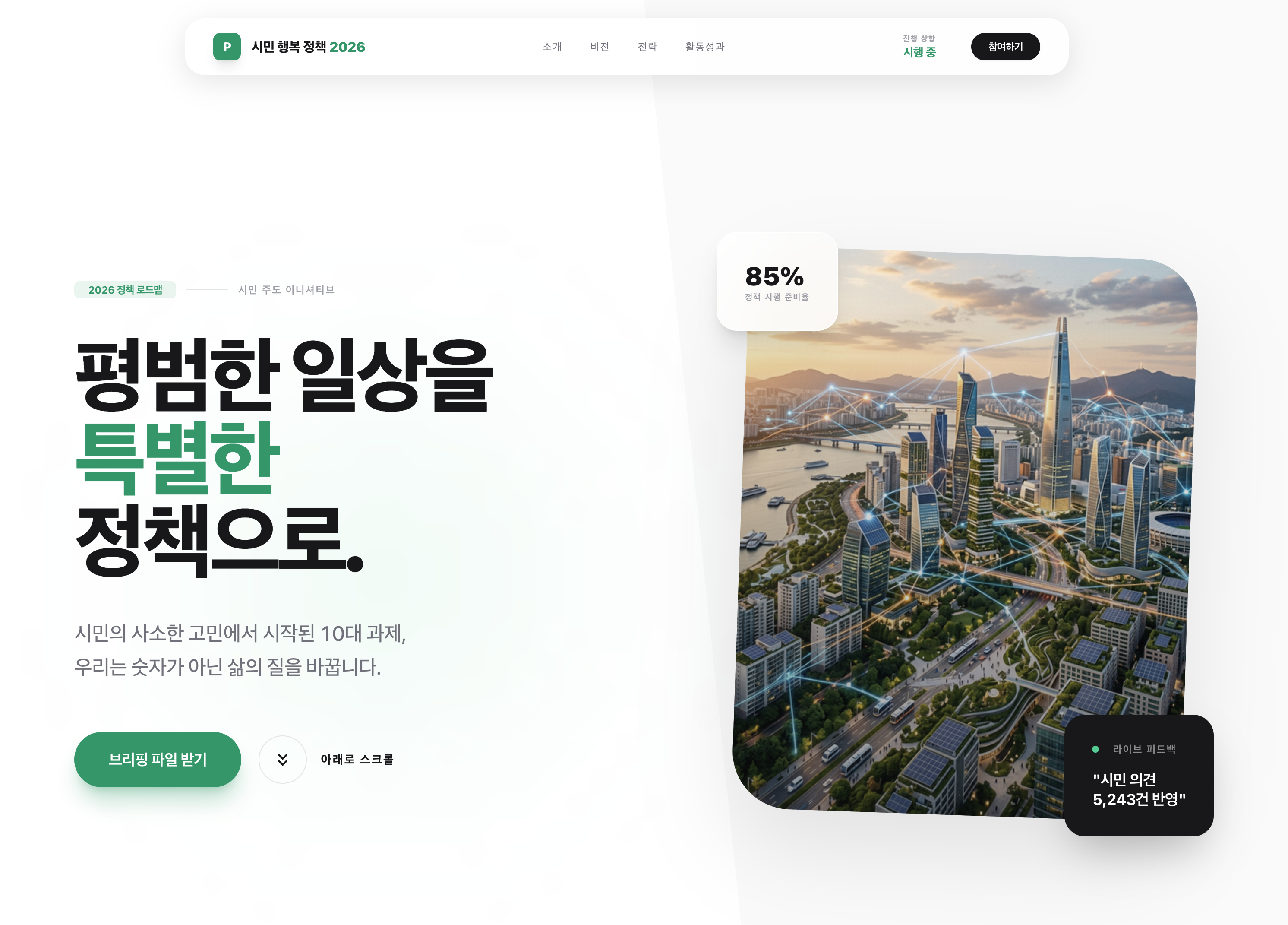 시민 행복 정책과 공공 사업을 효과적으로 전달하는 한국형 정책 홍보 웹사이트 데모입니다.