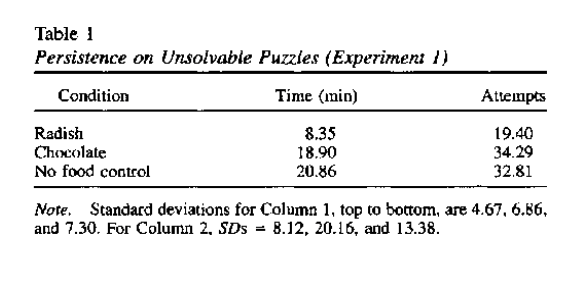 사람들을 한 방에 모아두고 초콜릿 쿠키를 구워 쿠키 냄새가 가득차게 하였다. A그룹 사람들에게는 초콜릿 쿠키와 디저트를 먹을 수 있게하고 다른 그룹에게는 무만 먹을수 있게 하였다. 그 뒤 퍼즐을 풀게 하였더니 A그룹 사람들은 평균 19분 정도 퍼즐을 풀고자 했지만, B그룹은 절반도 못미치는 8분정도밖에 집중력을 지속하지 못하였던 것이었다.